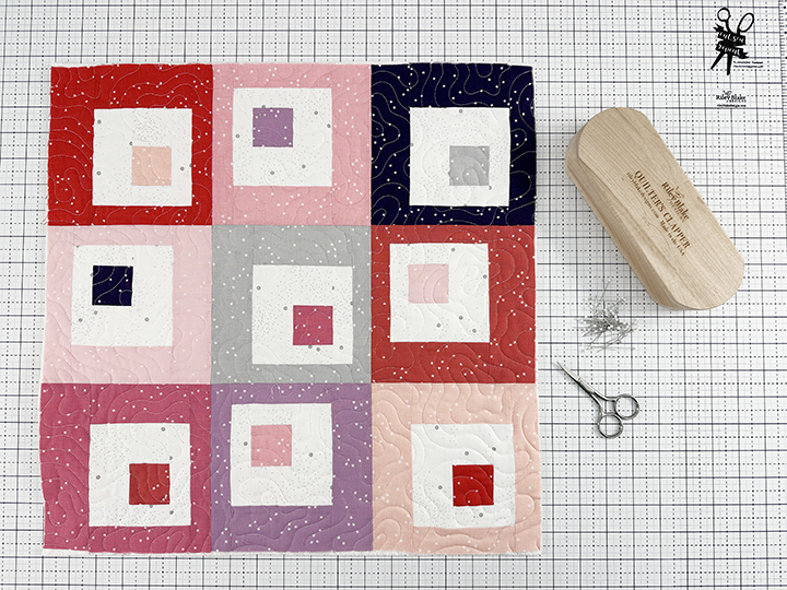 9. Layer the completed block on top of the 22-24″ batting and muslin squares and quilt the pillow top as desired. When you are done, trim the block to 18½”.