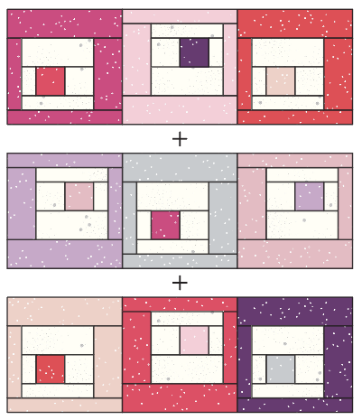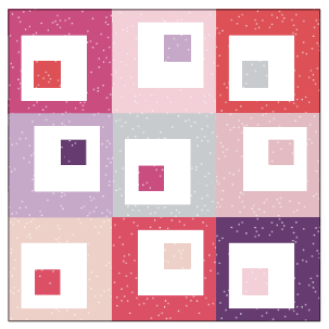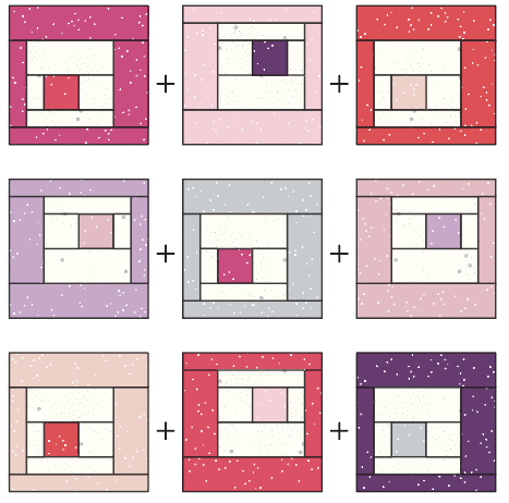 6. Lay out all (9) SQUARE BLOCKS into THREE rows as shown below, noting the direction of each block. Sew the THREE blocks in each row together and press the seams.