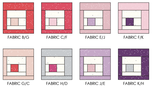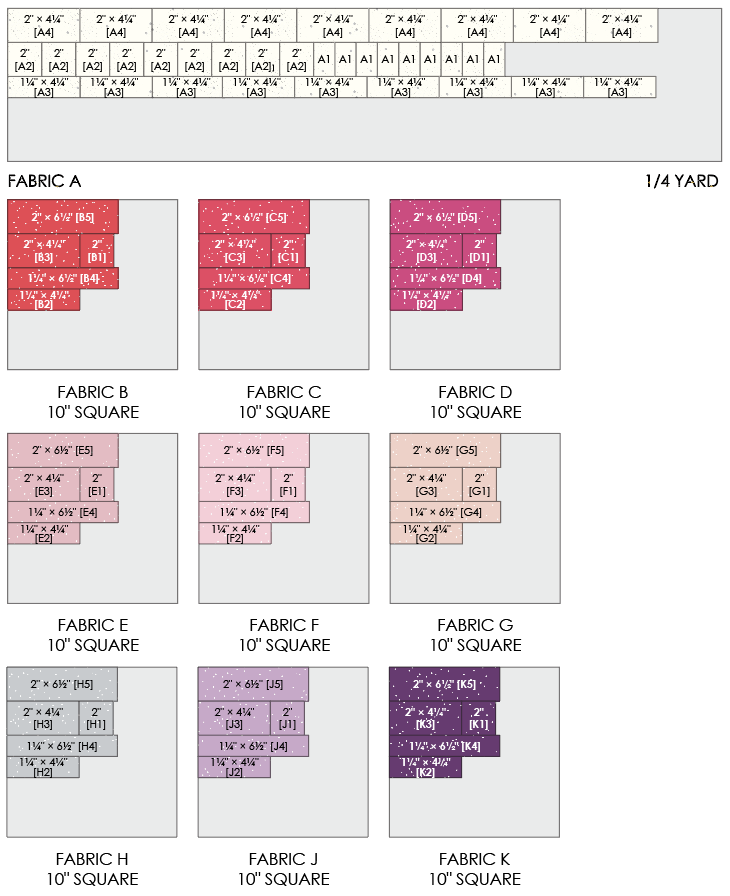 This pattern uses (1) BACKGROUND fabric [FABRIC A] and (9) ACCENT fabrics [FABRICS B-K]. Below are the requirements to make ONE 18″ block.