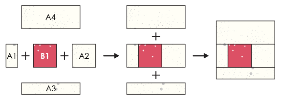 1. Lay out all (1) A1, (1) A2, (1) A3, (1) A4, and (1) B1 as shown below. Sew the A1 to the LEFT of the B1 and the A2 to the RIGHT. Press the seams.