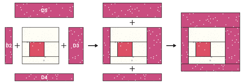 3. Lay out the D2, D3, D4, and D5 with the unit from STEP 1 as shown below. Sew the D2 to the LEFT of the unit and the D3 to the RIGHT. Press the seams.