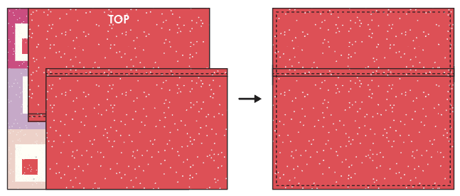 11. With the square top facing up, layer the envelope pieces RST on top of it as shown below and sew a 3/8″ seam around the edge of the pillow top.