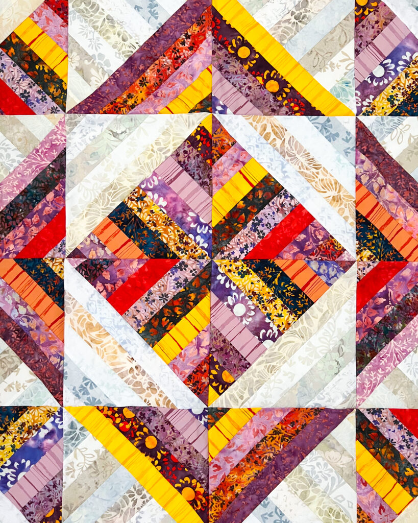 This technique is wonderfully straightforward: sew strips, join them, trim on the diagonal, and suddenly you’ve got a design full of movement. This one simple cut transforms steady stripes into dynamic designs, full of contrast and surprise. It’s approachable for confident beginners but still engaging for experienced makers looking for a quick, satisfying project.