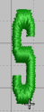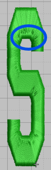 Satin stitches are used when a digitizer wants the stitching to flow with the shape of an object rather than running in a single direction. These stitches begin on one side of an area and travel smoothly to the other without interruption. The result is a sleek, slightly raised finish, which is why satin stitches are commonly used for lettering, such as the “S” shown below.