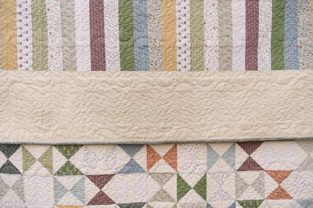 The back is mostly calm and creamy, with a pieced stripe panel that adds a fun “bonus” detail. I love a backing that feels intentional but still lets the quilting shine.