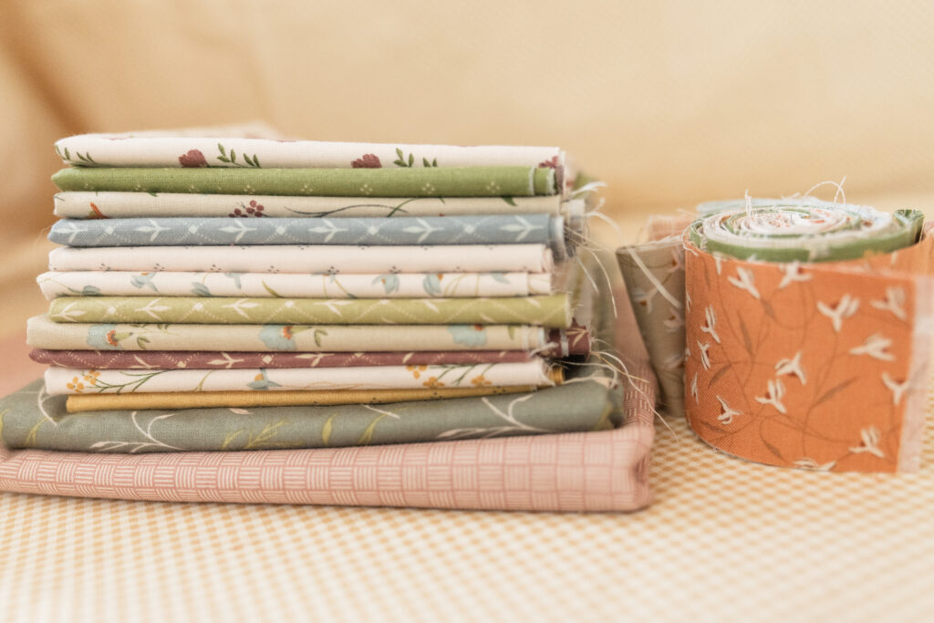 The palette is soft and steady—warm neutrals, muted greens, dusty blues, golden mustards, rusts, and deeper berry tones—balanced with low-volume prints that keep everything feeling light and airy. It’s scrappy in the best way: lots of variety, but still cohesive and calm.