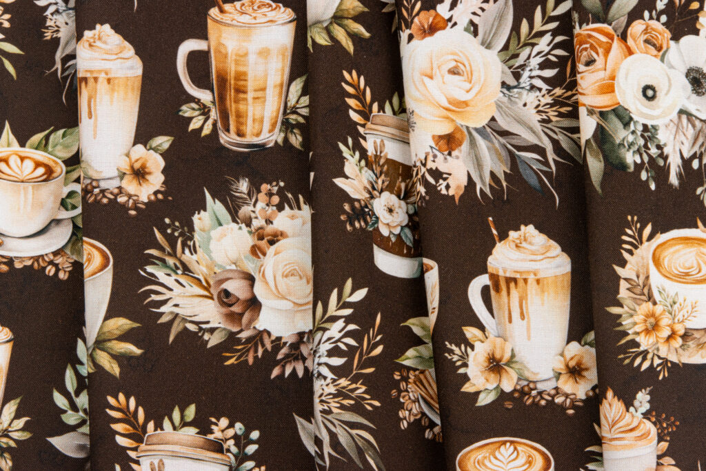 If coffee is your love language, perk up – you can almost smell the delicious aroma as you explore the main print of florals, mugs, and cups. With plaid, text, and swirl prints in a warm palette of cream, sage, brown, cinnamon, and shell, it’s time to espresso yourself! See it all on our storyboard below!