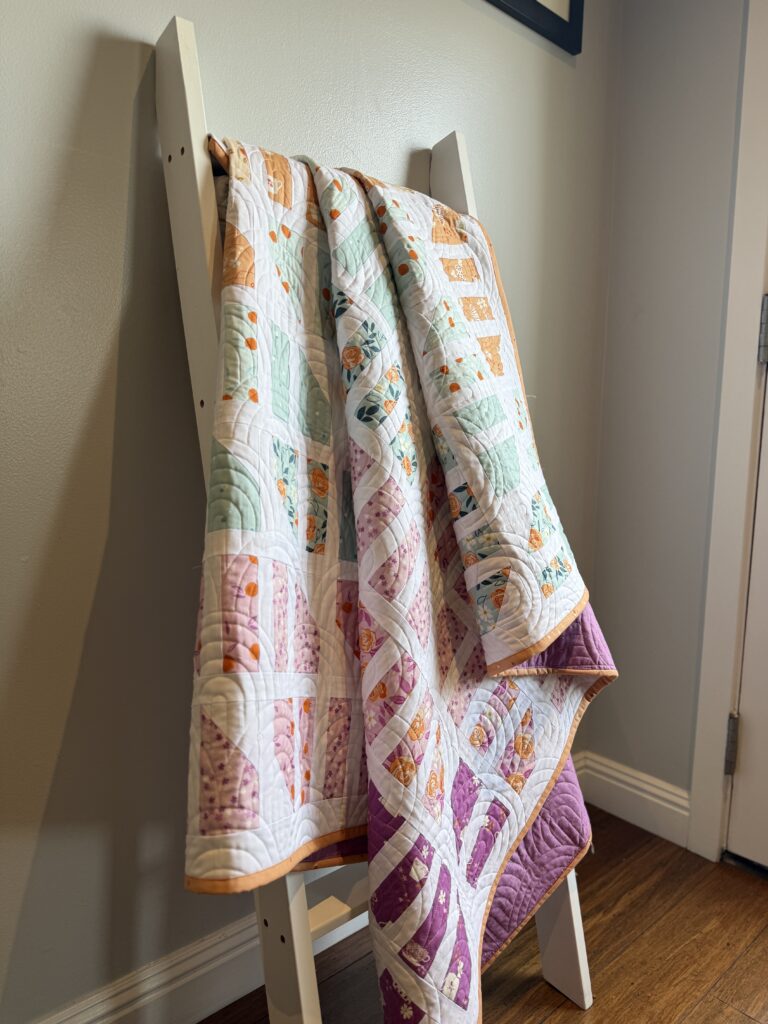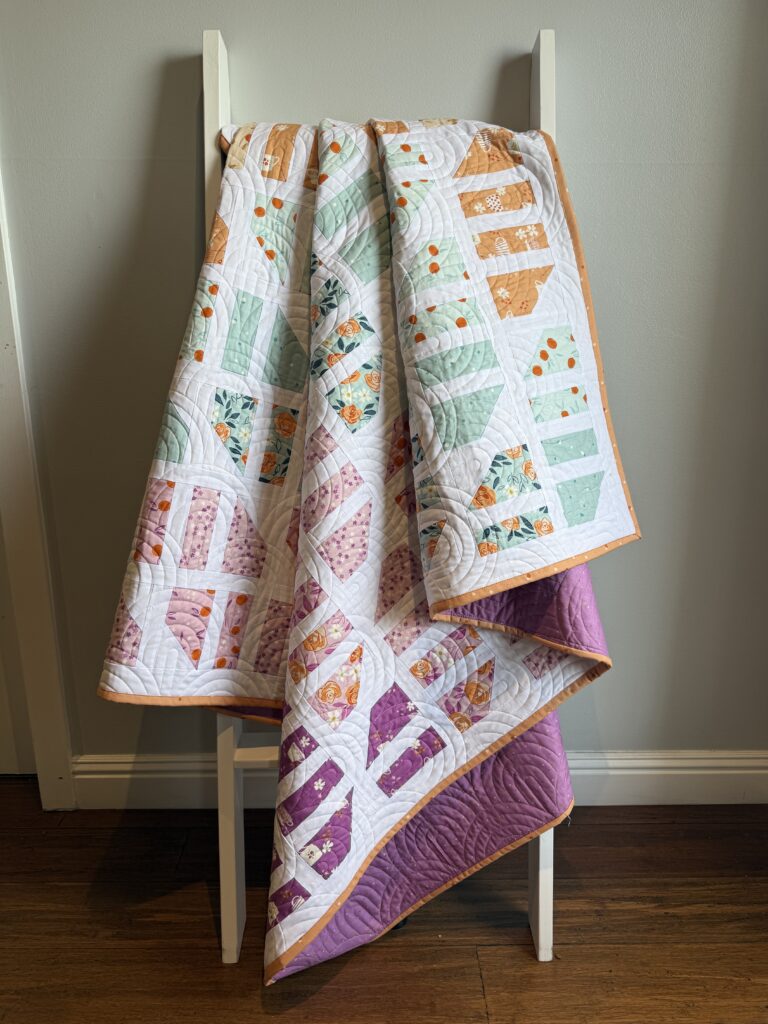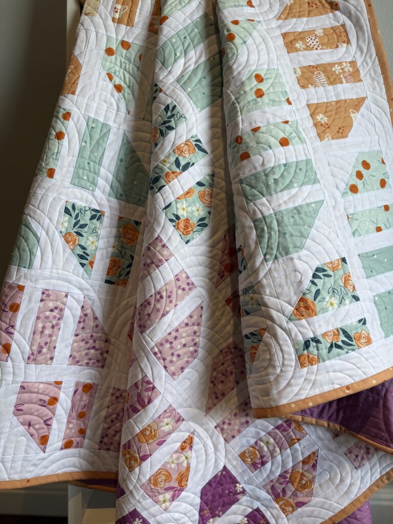 I got the opportunity to work with the newest collection from Fran Gulick, called Homage. This collection is full of sweet and simple prints – roses, teacups, hexagons, oranges, (and more!) – with the prettiest palette of purples, mint, and orange. I was in love with the concept of this collection as I learned about it’s creation. It was designed as a way to honor Fran’s grandmother and the memories she had growing up. This felt like a great opportunity to pair it with one of my most favorite quilts of mine, Ingleside.
