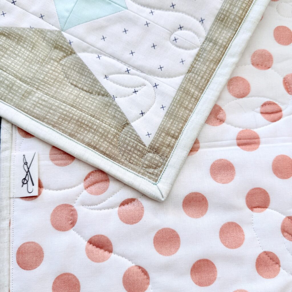 The En Point quilt is so stash friendly! I found everything in my remnant drawer. In this version, I used Confetti Cottons (Vivid, Sea Glass and Hint of Mint), Texture (Slate), and Bee Cross Stitch (Denim). Pink is not the the space of the recipients home; however, I don’t know how to not have pink in a project (IYKMYK). So I’m putting it on the back in this older rose gold dot fabric from RBD. (Hint: It currently not available but check Etsy for some!)