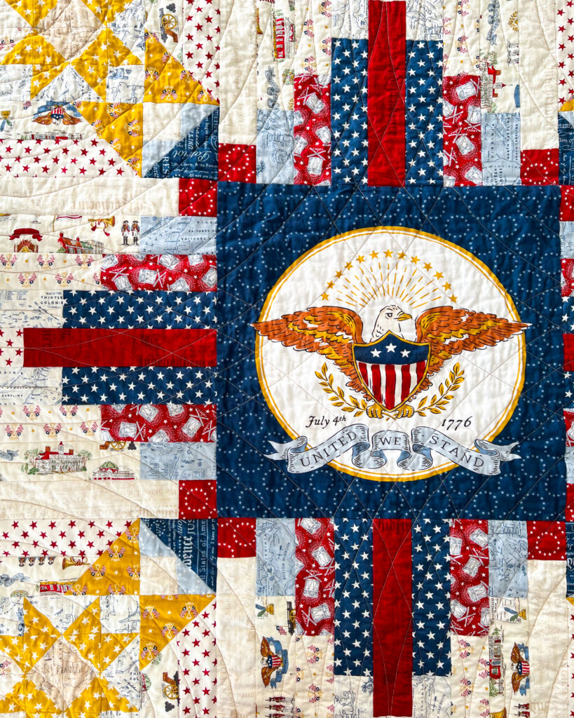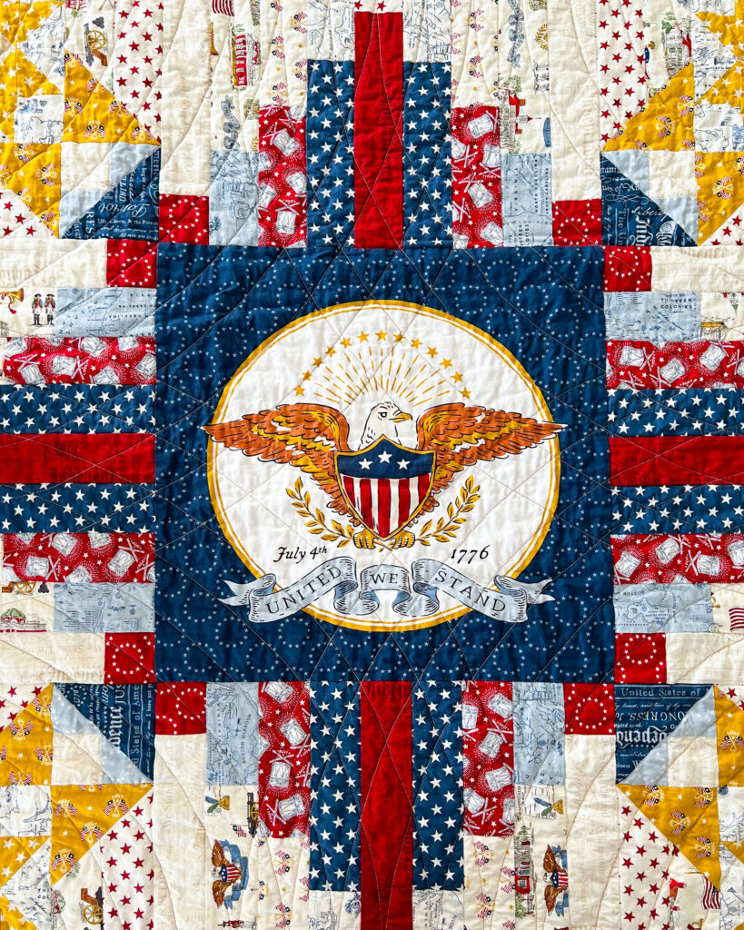 At the center of this Converging Paths quilt is the American Eagle panel, used in place of the traditional center block. Set against a deep blue background and framed like a seal, the panel is anchored by a United We Stand ribbon and dated July 4th, 1776. It provides a strong yet understated centerpiece, allowing the symbolism to remain clear while the surrounding piecing adds structure and movement.