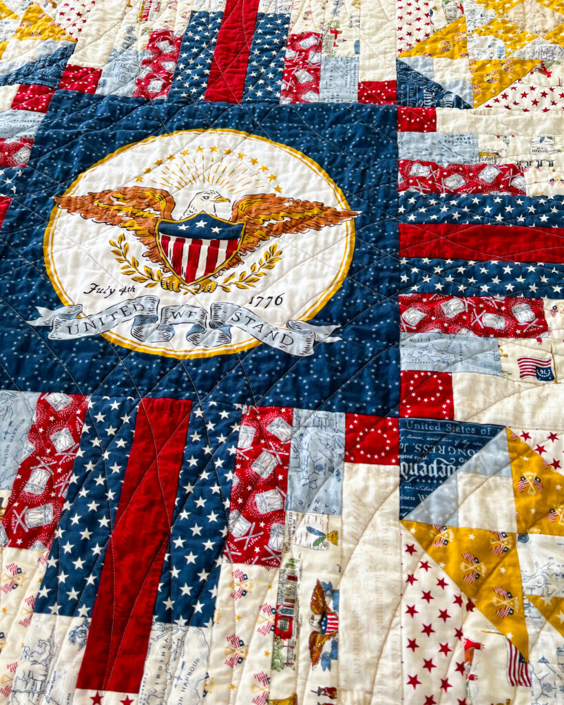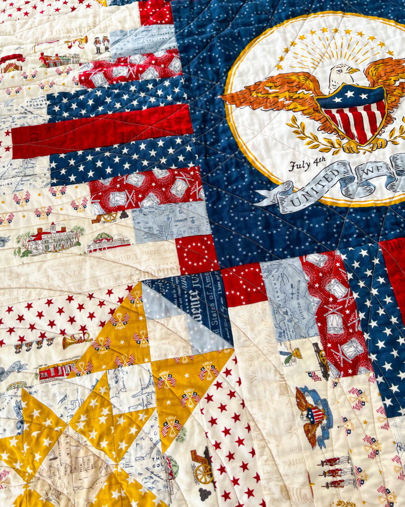 The Converging Paths quilt layout was chosen to support the fabric rather than compete with it. The Converging Paths Quilt Pattern will be releasing in late February and includes an alternative center option for showcasing panels like the American Eagle used here.