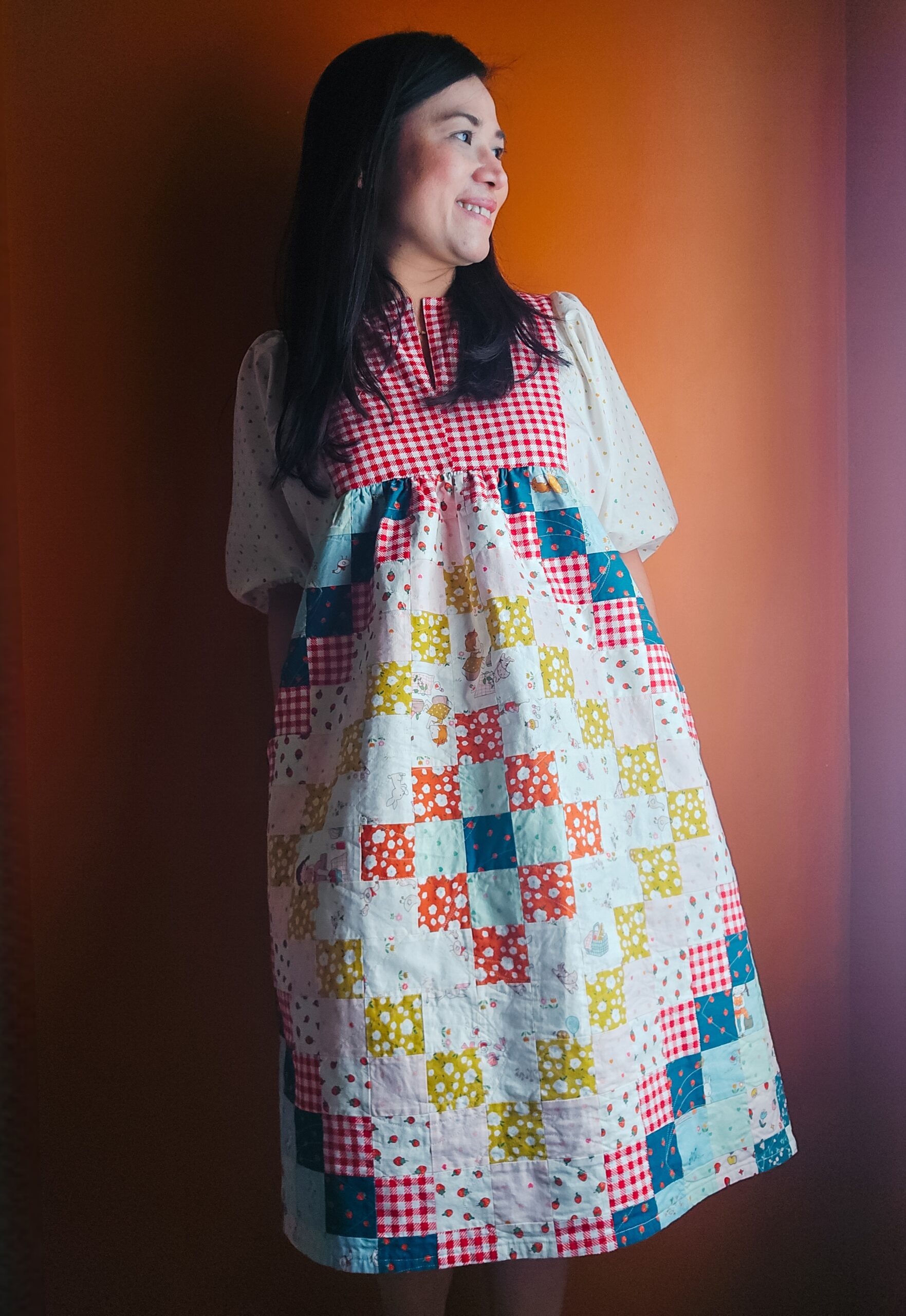 Hello, Friends! It’s Sandy from Thai Charm here. This project started with a simple idea. What if a quilt pattern could be scaled down and worn? For this dress, I used my Fade Quilt pattern as the starting point, then scaled the design down to create a patchwork fabric panel. Once the patchwork was finished, I treated it like yardage and cut my dress pieces right from it.
