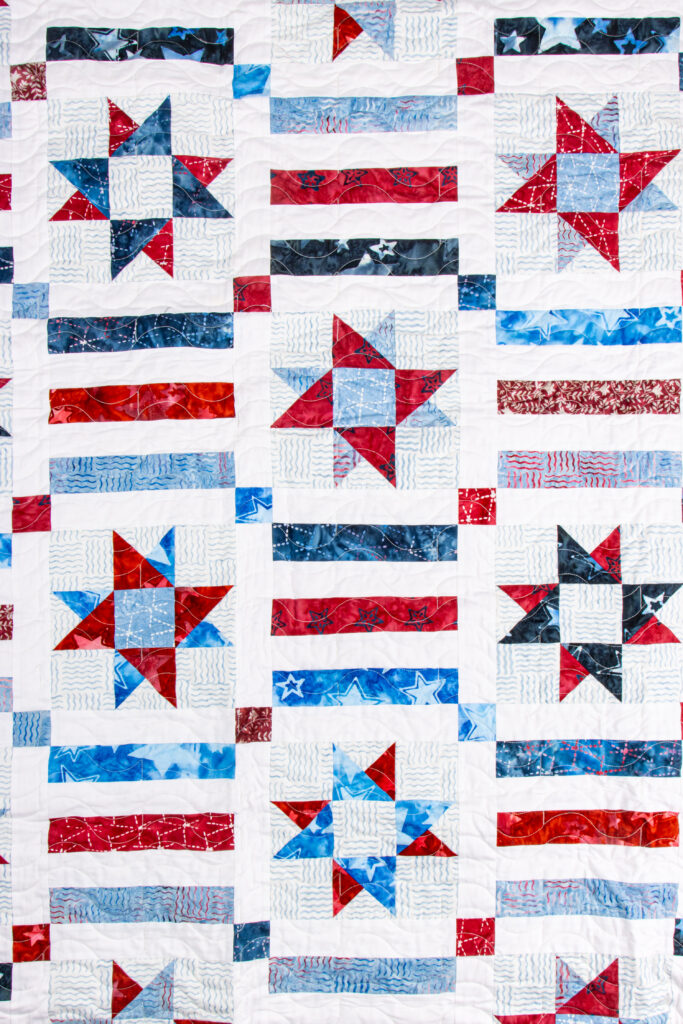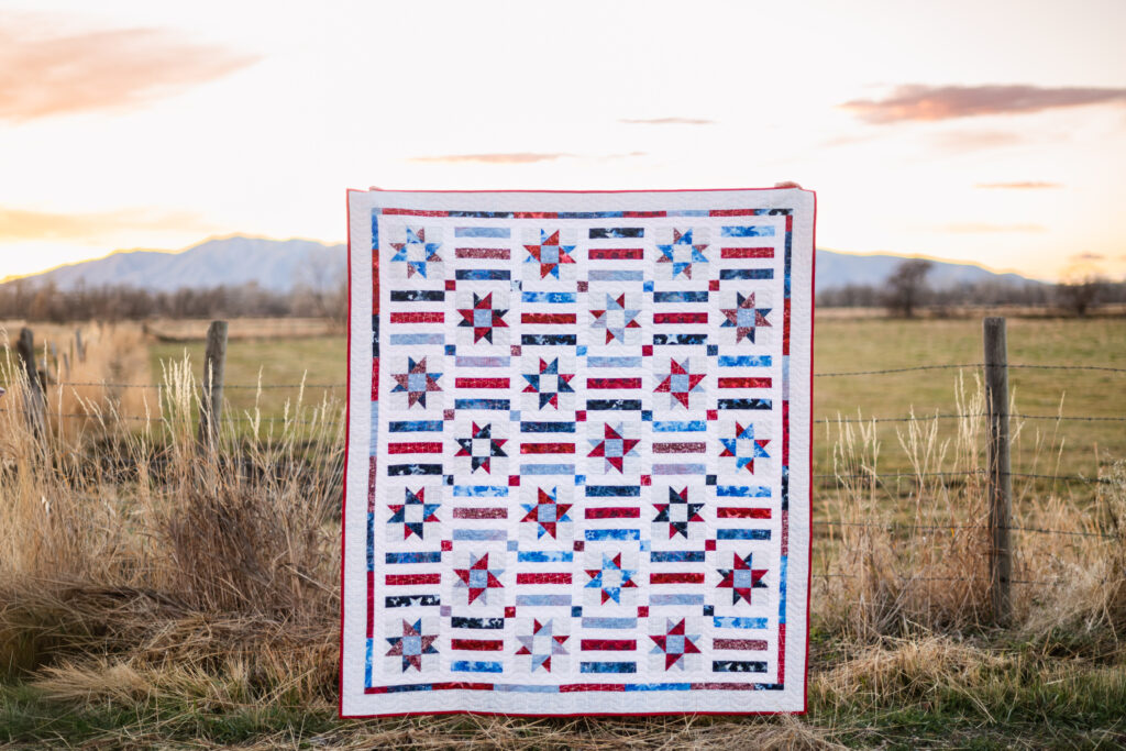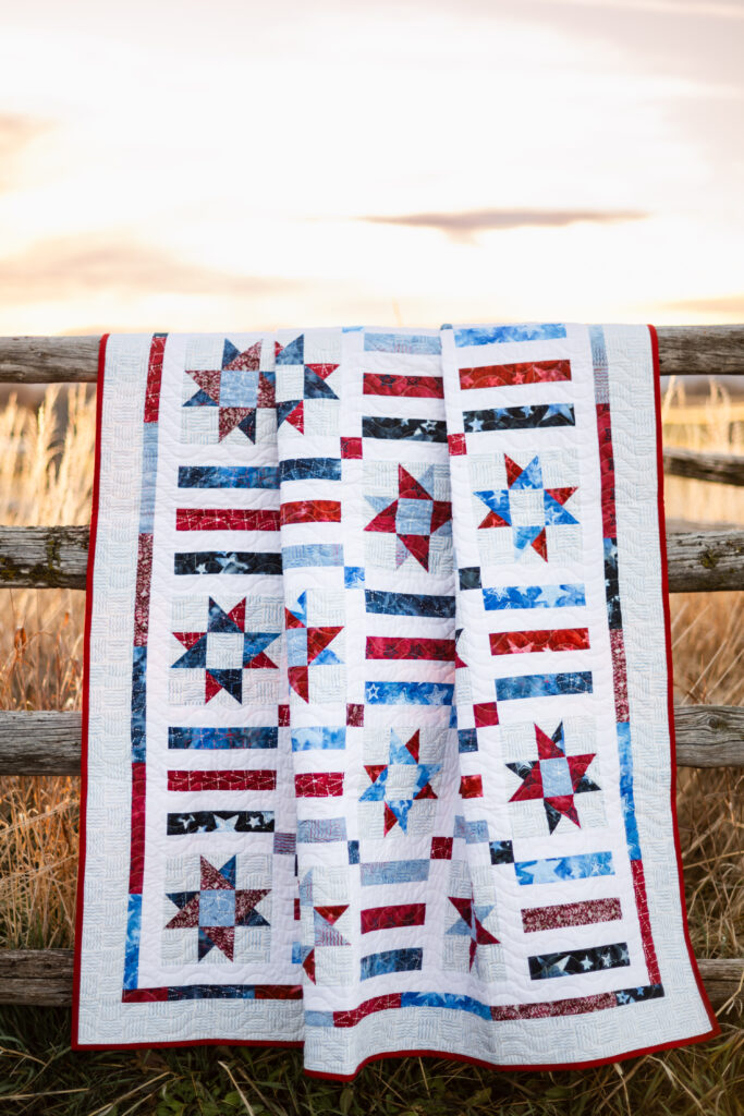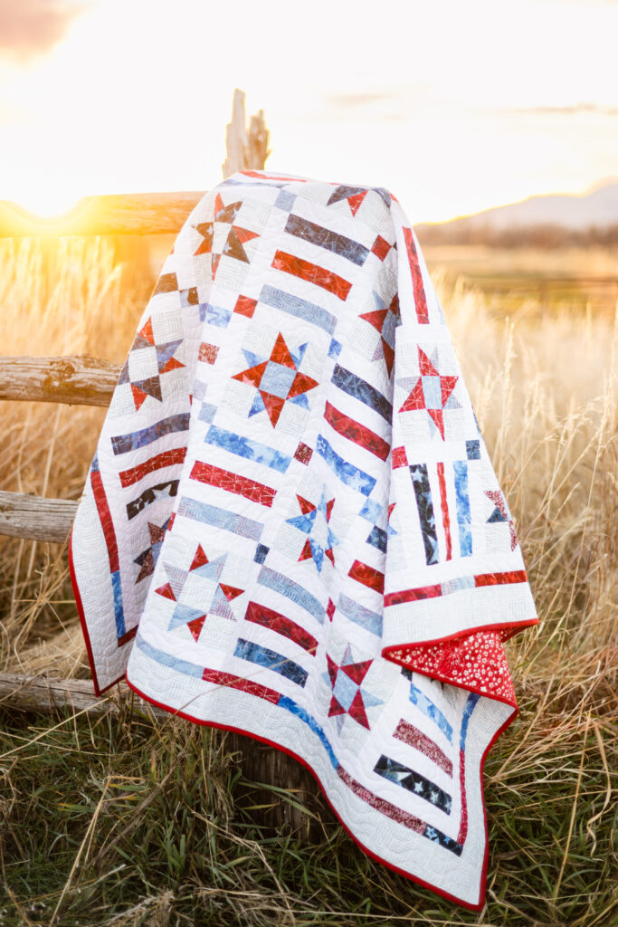 The Company B Quilt by Quilt Boss Design is named after the Boogie Woogie Bugle Boy of Company B. You can almost hear the music as you wrap yourself up and enjoy the parades and fireworks! Finished size is 64″ x 73″. Head over to the Quilt Boss Design website to purchase the paper or PDF version of the pattern!
