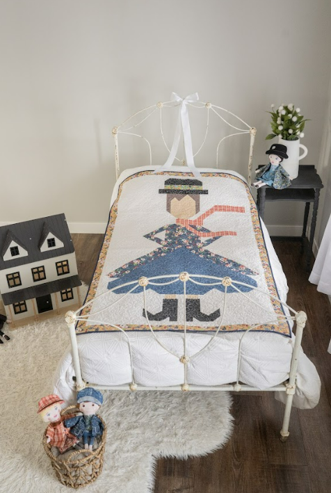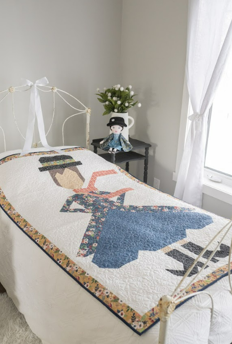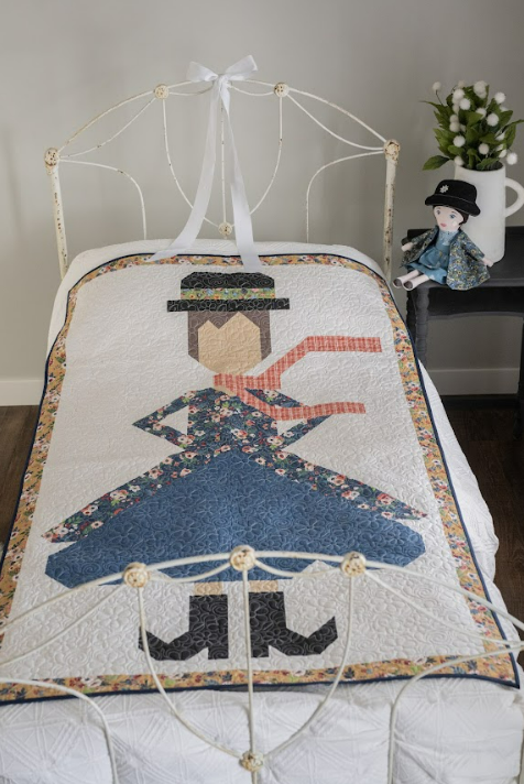 The Mary Poppins Quilt features a beautifully pieced character block that brings the famous umbrella carrying nanny to life in fabric. From her hat and scarf to the flowing skirt and classic boots, each section of the quilt is thoughtfully constructed to create the recognizable silhouette.