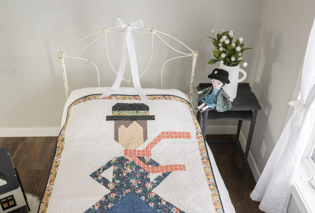 The Mary Poppins Quilt features a beautifully pieced character block that brings the famous umbrella carrying nanny to life in fabric. From her hat and scarf to the flowing skirt and classic boots, each section of the quilt is thoughtfully constructed to create the recognizable silhouette.