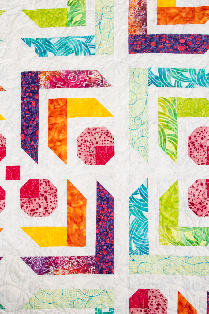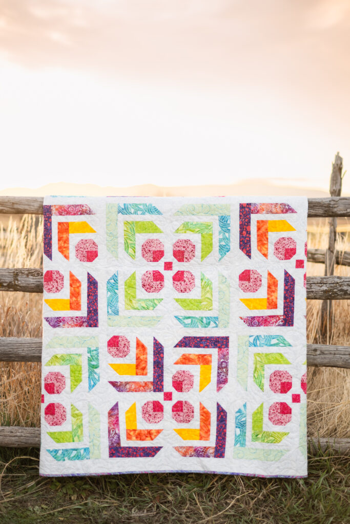 The colors in this version are so good! Bright pinks, oranges, greens, and aquas, all with that signature batik texture that adds a little extra depth without feeling busy. Every block pops against the background, and the whole quilt has this really playful feel to it that keeps your eye moving.