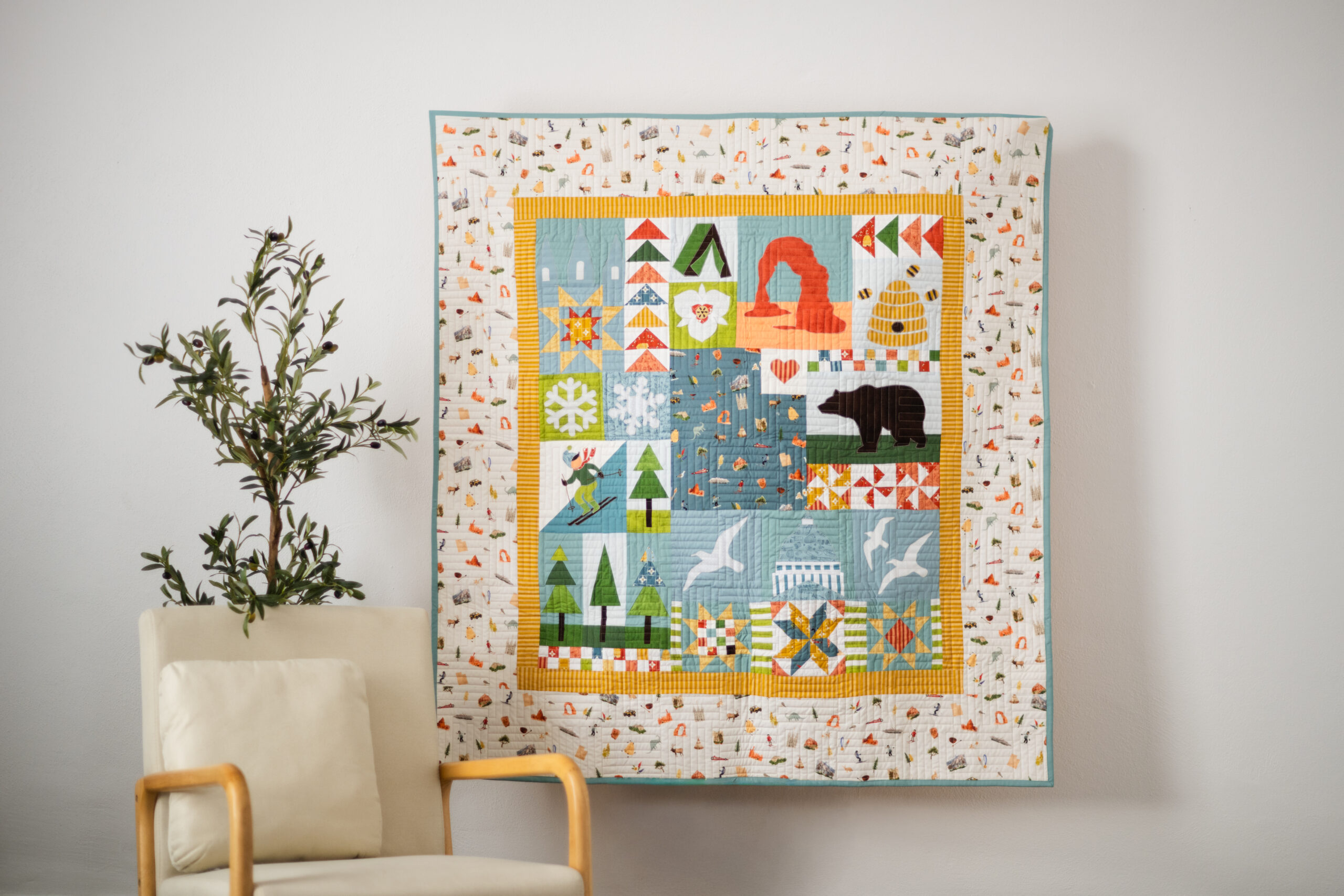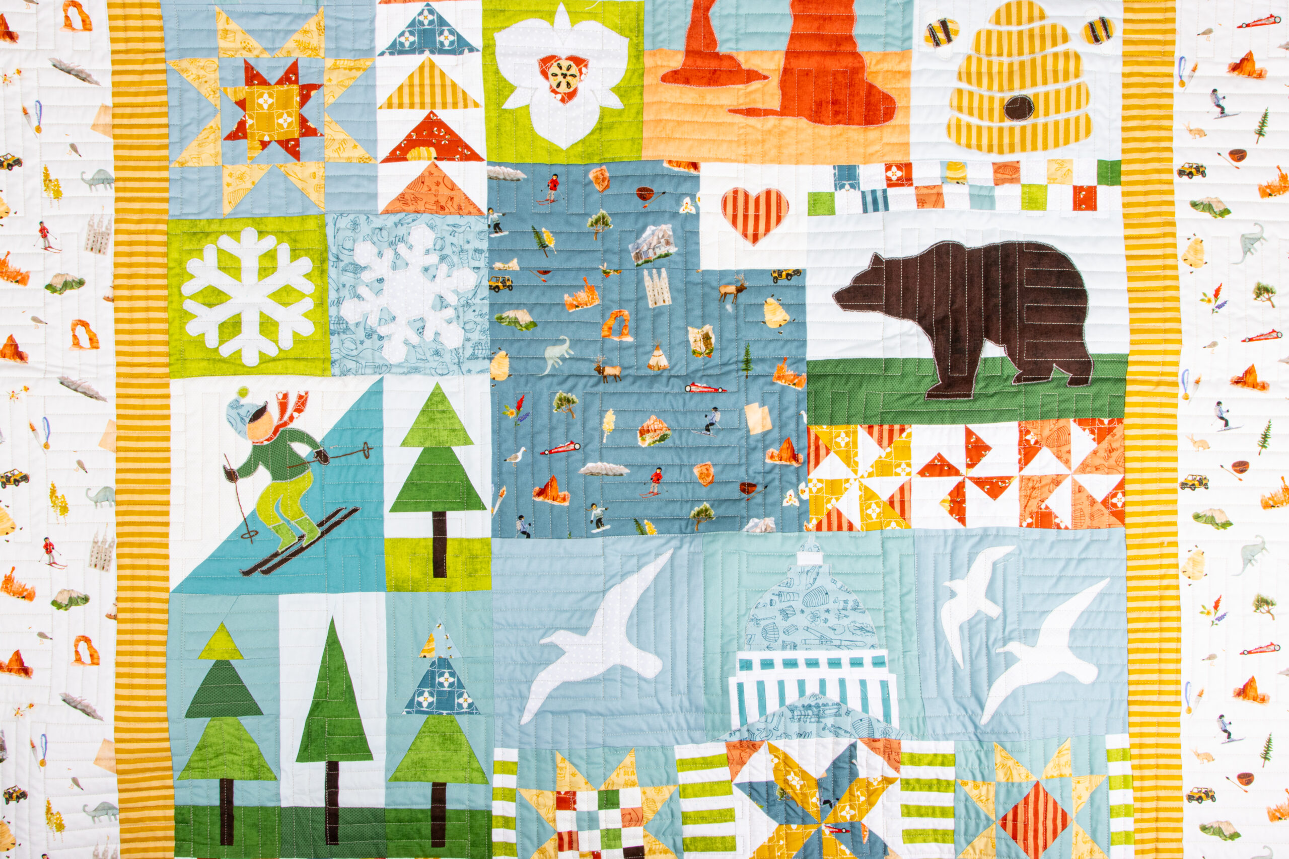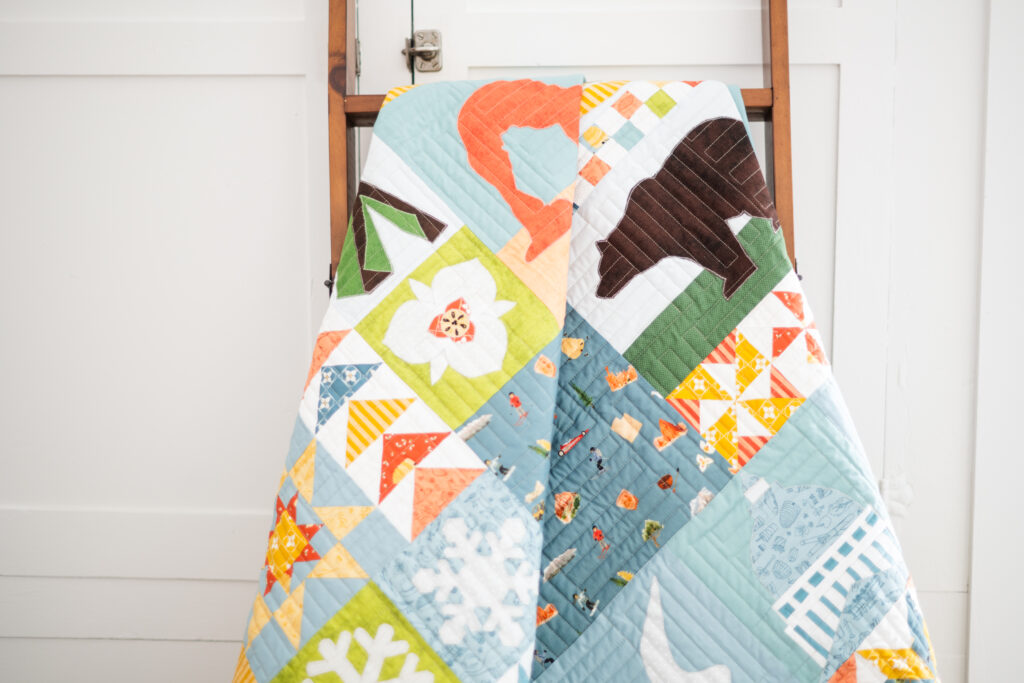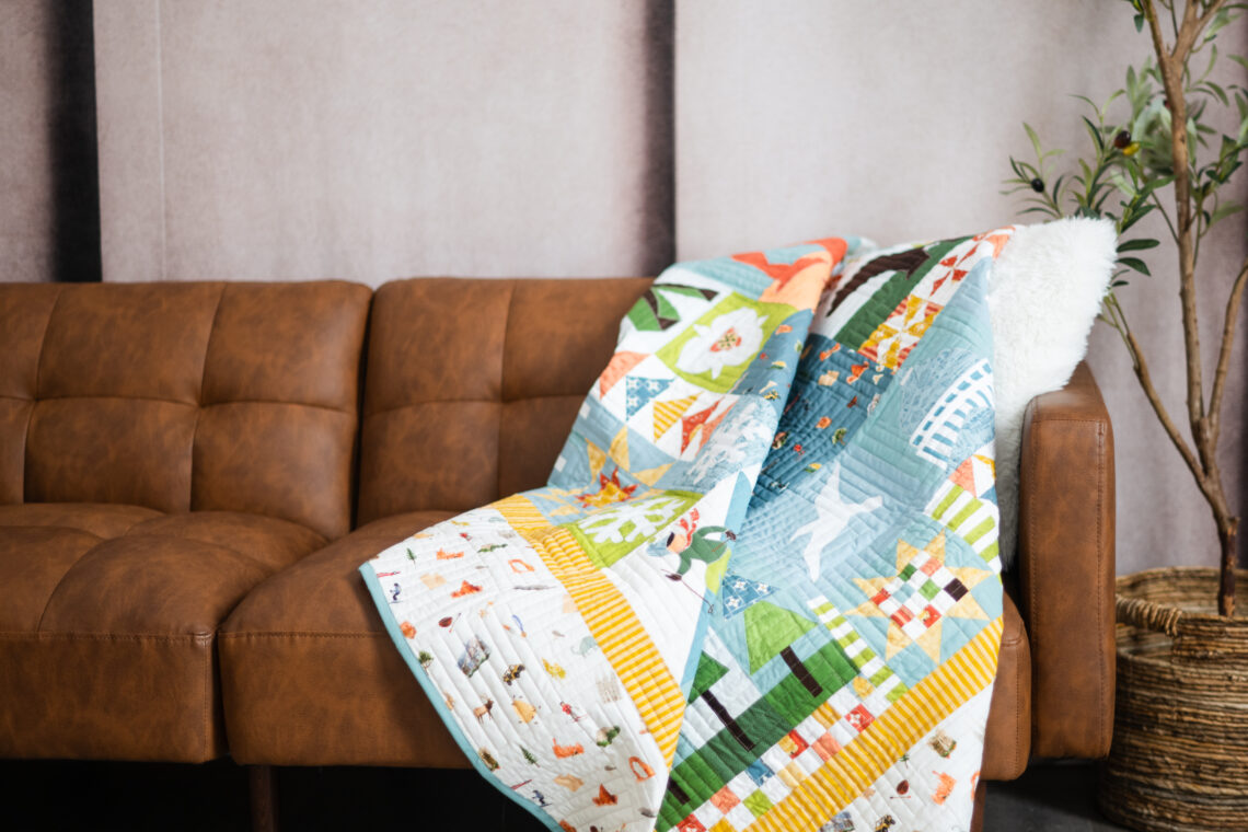Featuring the Utah collection by Kelsey Carlson, this quilt is full of fun, meaningful details, from outdoorsy icons to classic quilt blocks, all brought together in a playful, modern layout. It’s the kind of quilt that tells a story, and we love how it celebrates the beauty and charm of Utah.