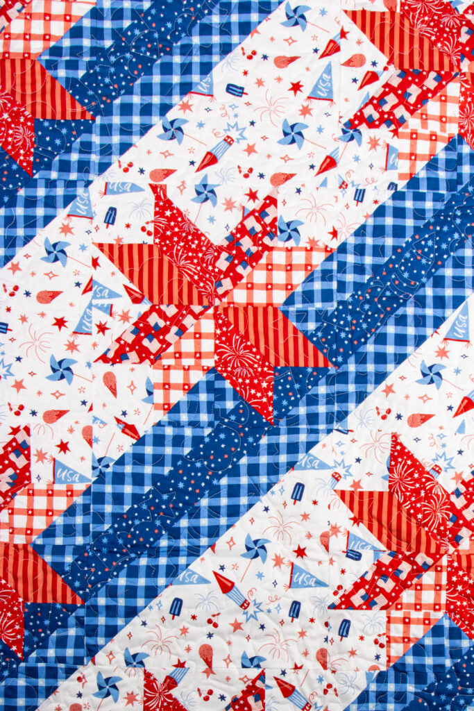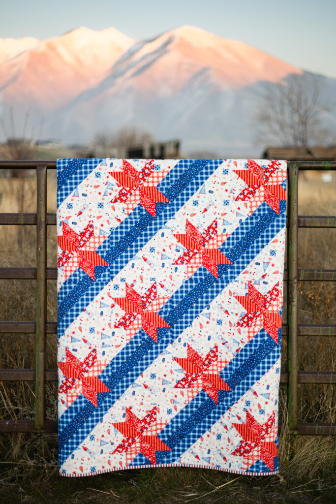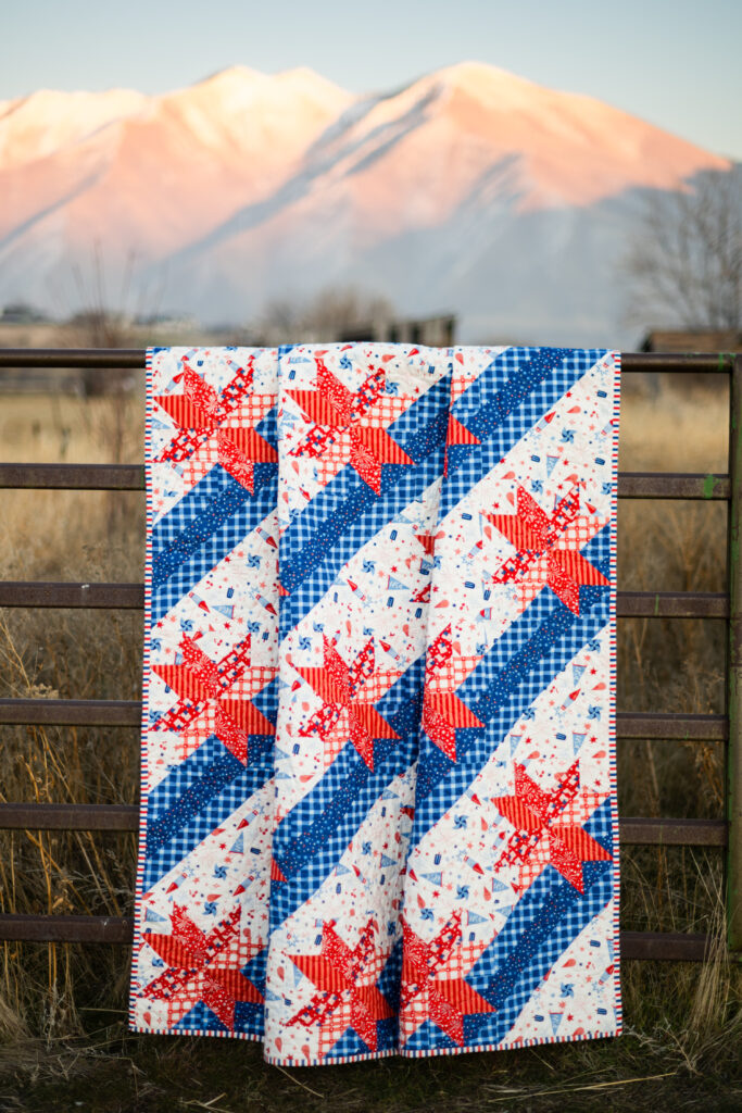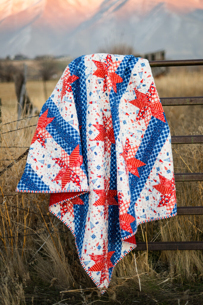 The Firecracker Freefall Quilt is bursting with Americana spirit! A star-spangled celebration, this quilt features Firecracker fabrics by My Mind’s Eye in classic palette of red, white, and blue. The fireworks, flags, plaid, stars, and stripes are perfect for projects like this that honor the USA with timeless patriotic charm. Download the FREE pattern by The RBD Designers below!