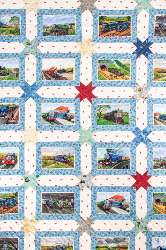 Thomas the Tank Engine first came to life through stories told by a father to his son. With a little imagination, the railroad noises outside their window became the chatter of the engine friends and exciting adventures on an island called Sodor. Over 80 years later, those stories continue to captivate audiences around the world through TV, books, toys, podcasts, music, live events, and now quilts like this one!